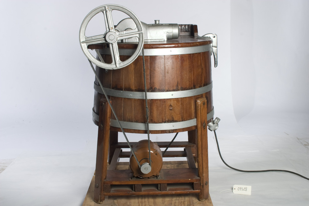 Erres elektrische langzaamwasser, een houten wasmachine met gesloten drijfwerk op het deksel, en zelfstartende motor met V-snaar overbrenging. Tot in de jaren zestig werden nog houten apparaten verkocht, totdat zij uiteindelijk plaats moesten maken voor metalen machines. Motor fabr. Welco.