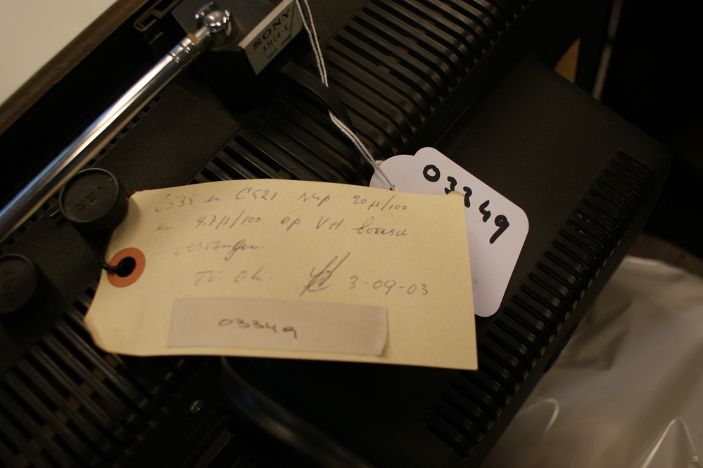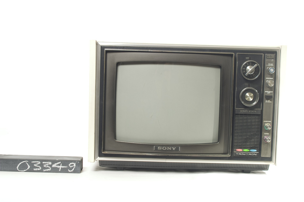 Sony KV-1300E, draagbare kleurentelevisie, zilverkleurig en zwart, in een houten kast. Aan de rechterkant van het scherm zit een verticaal paneel met twee grote zilverkleurige knoppen voor volume en zenderkeuze, met daarnaast nog eens vier kleinere draaiknoppen en één smalle zwarte knop. Rechtsonder zijn er drie ovalen streepjes te zien (roze, groen, blauw) met de ...