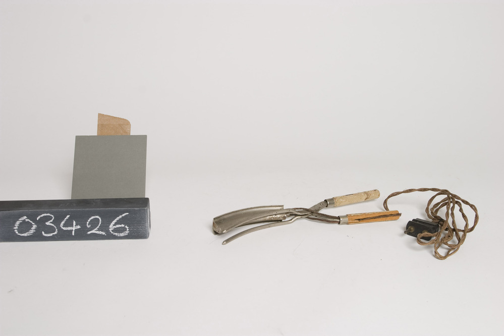 Onbekend fabricaat krultang met elektrische verwarming, 220V. In een gebogen langwerpige cilindrische vernikkeld metalen behuizing met houten handvatten. Aan één daarvan is een bruin textielomwonden twee aderig apparaatsnoer met een rechthoekige zwart bakelieten contactstop bevestigd.