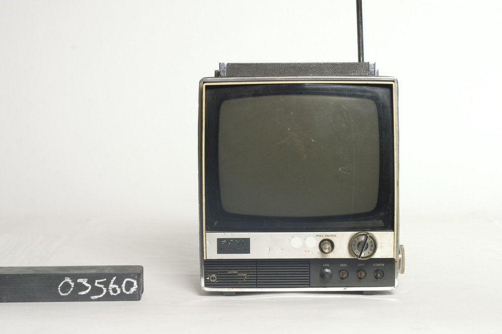 Sony TV-110UK, draagbare zwart-wit televisieontvanger, in kunststof kast met zwart omrand scherm. Onder het scherm zit een zilverkleurige strook met links een zwart plaatje 'SONY SOLID STATE', en rechts twee draaiknoppen. De luidspreker en nog vier andere functies (waarbij drie van de vier knoppen missen) bevinden zich uiterst beneden aan een zwarte voorzijde. Rechts van ...