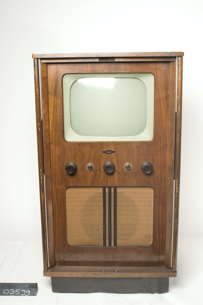 Bush Radio TUG34A televisieontvanger, 220V - 150W, in hoge houten kast met achterwand. Het toestel is ingedeeld met boven een grijs omrand scherm, daaronder een bruin horizontaal plaatje met 'BUSH', vervolgens drie bruine kunststof draaiknoppen met daartussen twee kleinere kunststof draaiknoppen (met 'VERTICAL HOLD' en 'HORIZON-TAL HOLD'), en onderaan een brede luidspreker met drie donkere ...