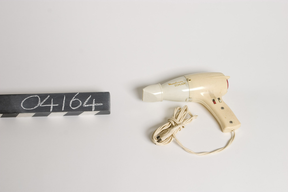 Moulinex Tomado haardroger met axiaalventilator en elektrische verwarming, 220/240V 400W. In een pistoolvormige crème/wit kunststof behuizing waaraan een plat twee aderig wit kunststof snoer met een aangegoten platte contactstop is bevestigd.