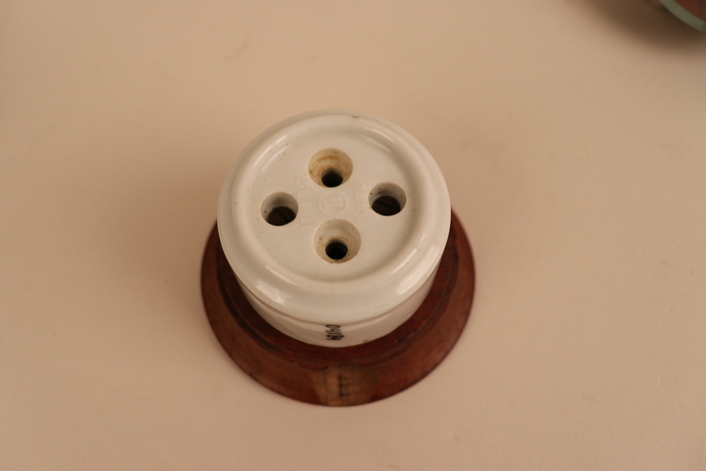 Onbekend fabricaat contactdoos 250V - 6A, 2-polig, wit porselein op houten bevestigingsplaat.