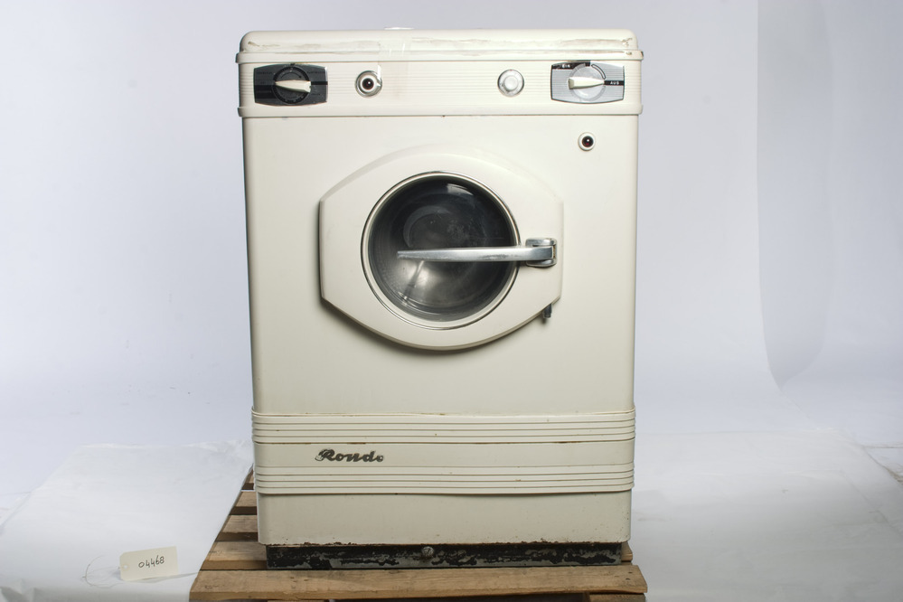 Rondo witte vierkante wasmachine, element 5550 Watt, met bovenin links een draaiknop voor het wassen en rechts een draaiknop om aan en uit te zetten (tussen deze knoppen zit nog een rood lampje en nog een kleiner draaiknopje). In het midden van de wasmachine bevindt zich de ovale deur met hendel en rond raam, en ...