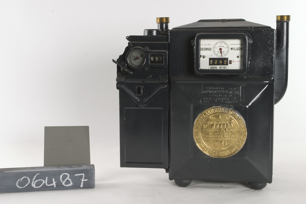Wilson muntgasmeter met zwart metalen behuizing, klein vierkant wit venster met rode wijzer, en een grote goud kleurige zegel op de onderhelft. Het apparaat heeft aan de linkerkant een lang vierkant aanhangsel met een klein rond klokje en daarnaast een vierkant metertje met drie cijfers. (De gasmeter heeft een wijzerschaal: 0 50 dm3 en een ...