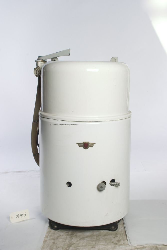 Ronde wasmachine van wit metaal rijdend op vier kleine wielen. Op voorzijde rood emaille Philips logo. Aan achterzijde aansluiting voor water en elektriciteit, aan voorzijde voor gas. Met 2 wasslangen.