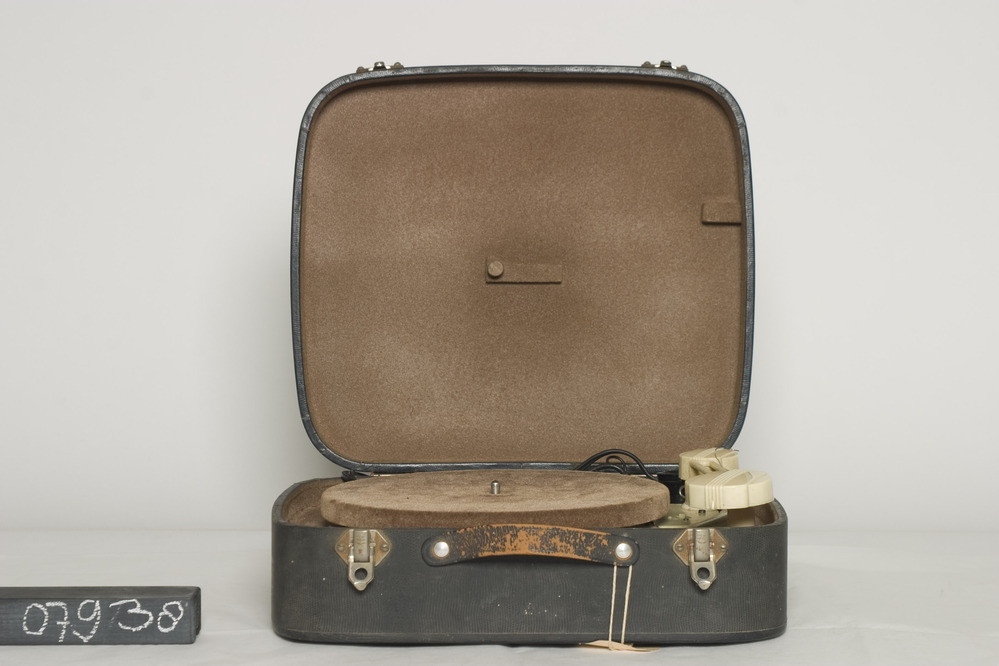 Philips draagbare platenspeler in zwarte koffer, 220 V-50 Hg 45-10 W, met bruin textiele voering, witte kunststof onderdelen en zwart snoer. Het handvat van de koffer is versleten en heeft daardoor een oranje kleur. Serienr. E51992 E.