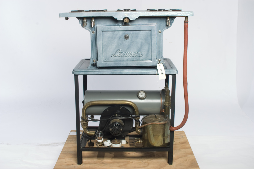 Lawson fornuis. Lichtblauw geëmaillerde gietijzeren kooktoestel met links twee en rechts één zilverkleurige gaskraan, en is via een rode slang verbonden met een compressorinstallatie onder de tafel. Het geheel staat op een zwarte metalen vierkantebuis-tafel.