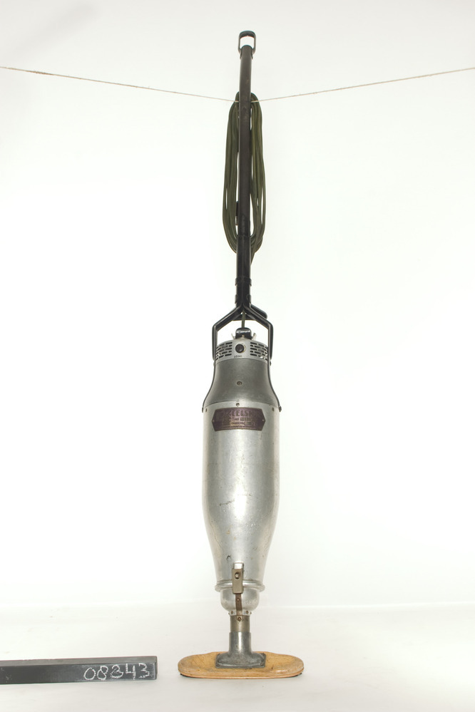 Excelsior elektrische steelstofzuiger 220V, met langwerpig grijs metalen huis, bruin mondstuk, en zwarte steel waar een zwarte kabel omheen is gewikkeld. Fabr.serienr: 119015. Schenking van: Bart Mackor, Amsterdam.