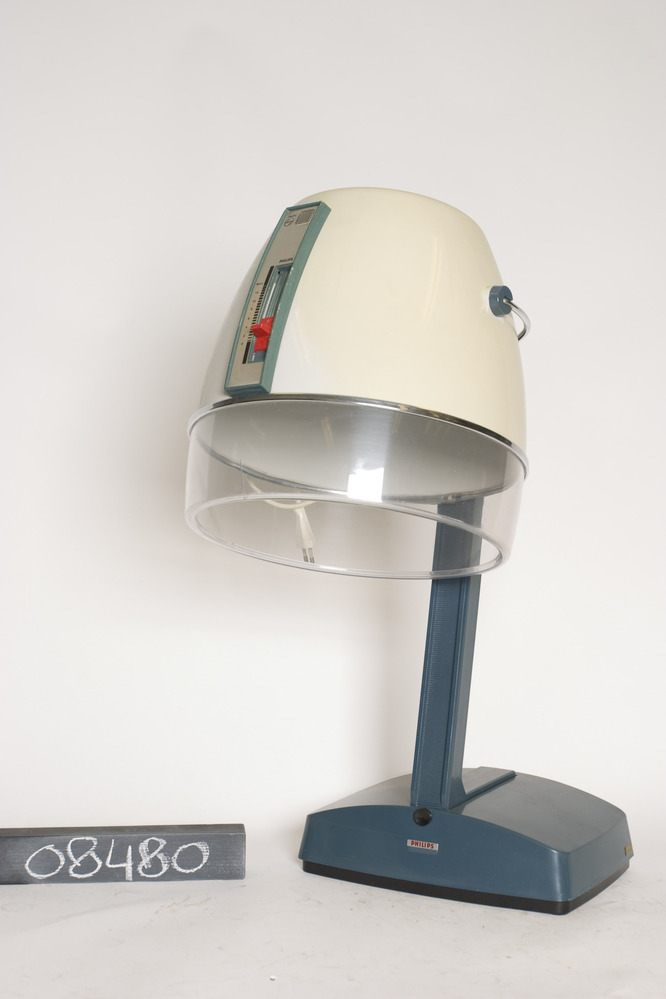 Philips haardroogkap met elektrisch verwarmde föhn, type HK 4120 X, met rode schuifknop op blauwgrijs verticaal paneel. Het apparaat heeft een crème kunststof behuizing met doorzichtige onderrand ter bescherming van het gezicht, en is gemonteerd op een grijze kunststof tafelstandaard. Onderaan de voorzijde staat op een plaatje in rode letters 'PHILIPS'. 220V 550W 50Hz. Fabr.serienr: ...