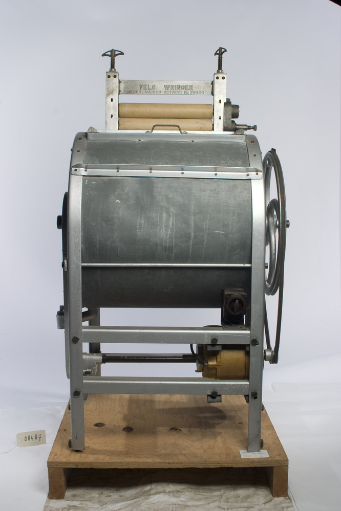 Velo elektrische trommelwasmachine, verzinkt en op vier poten, met handbediende bruine wringer. Nederlandsch octrooi no 28400. Er liggen 2 losse schroeven bovenop de wringer.