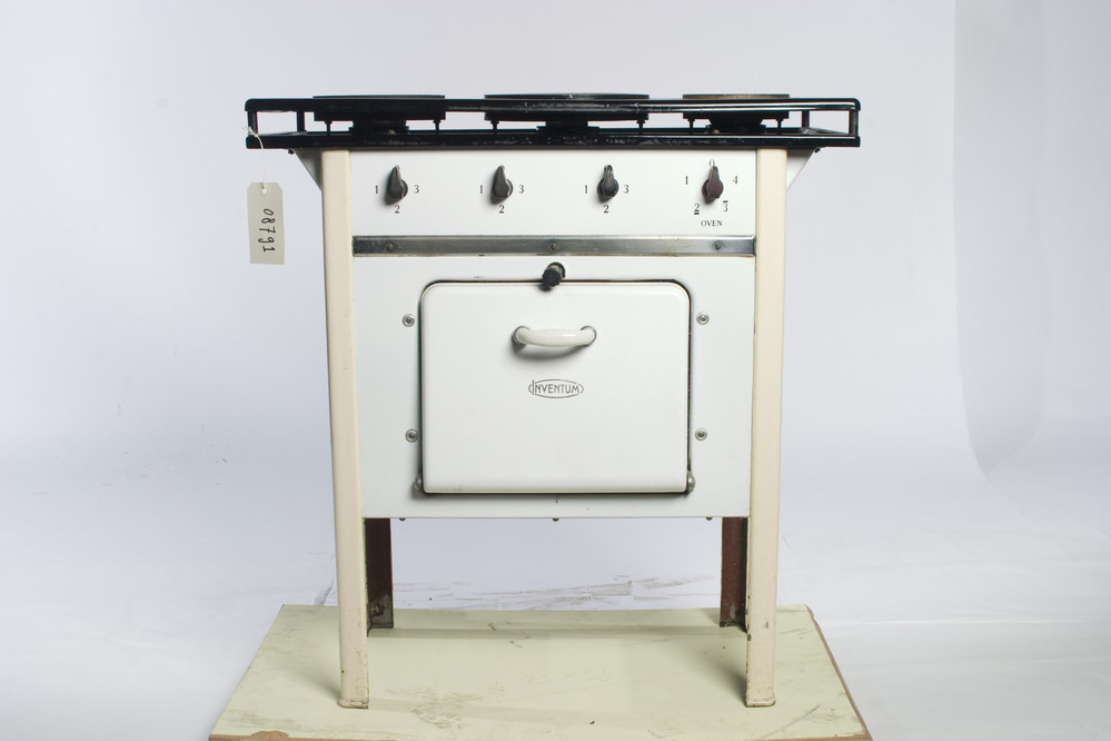 Inventum emaille elektrisch fornuis, 5600W, met een zwart gasstel bovenop de witte behuizing, met vier zwarte draaiknoppen en een ovenklep met hendel. Het fornuis wordt gedragen door vier witte poten en heeft het logo van Inventum op de ovenklep. Fabr.serienr: 871477.