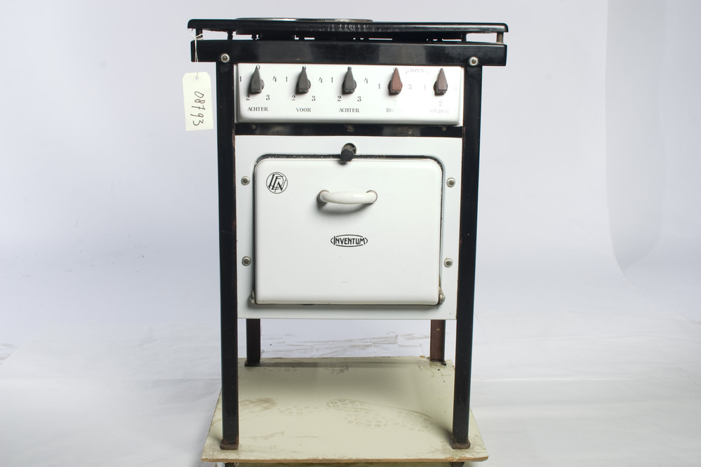 Inventum emaille elektrisch fornuis, 5700W, met een zwart gasstel bovenop de witte oven, met vijf zwarte draaiknoppen en een ovenklep met hendel. Het fornuis wordt gedragen door vier zwarte poten en heeft logo's van PEN en INVENTUM op de ovenklep. Fabr.serienr: 651959.