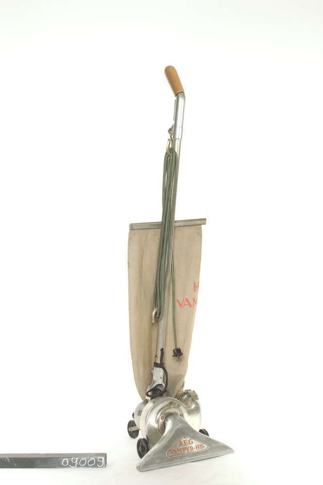 AEG Vampyr elektrische steelstofzuiger, 220V - 165W. Serienr: 81191. Merktekens: 1931. Model: rijdend. Besturing: steel. Stofopvang: uitw.stofzak. Kenmerken: horizontaal motorhuis op 3 uitw. kunststof wielen, mondstuk afneembaar en verwisselbaar, voor slang (niet aanw.) hoogte-instelling zuigmond d.m.v. stelschroef op achterwiel, vast niet origineel aansluitsnoer, 2 uitwendige snoerophanghaken, alg. uiterlijk: goed. Kleuren & materialen: aluminium huis, vern. ...