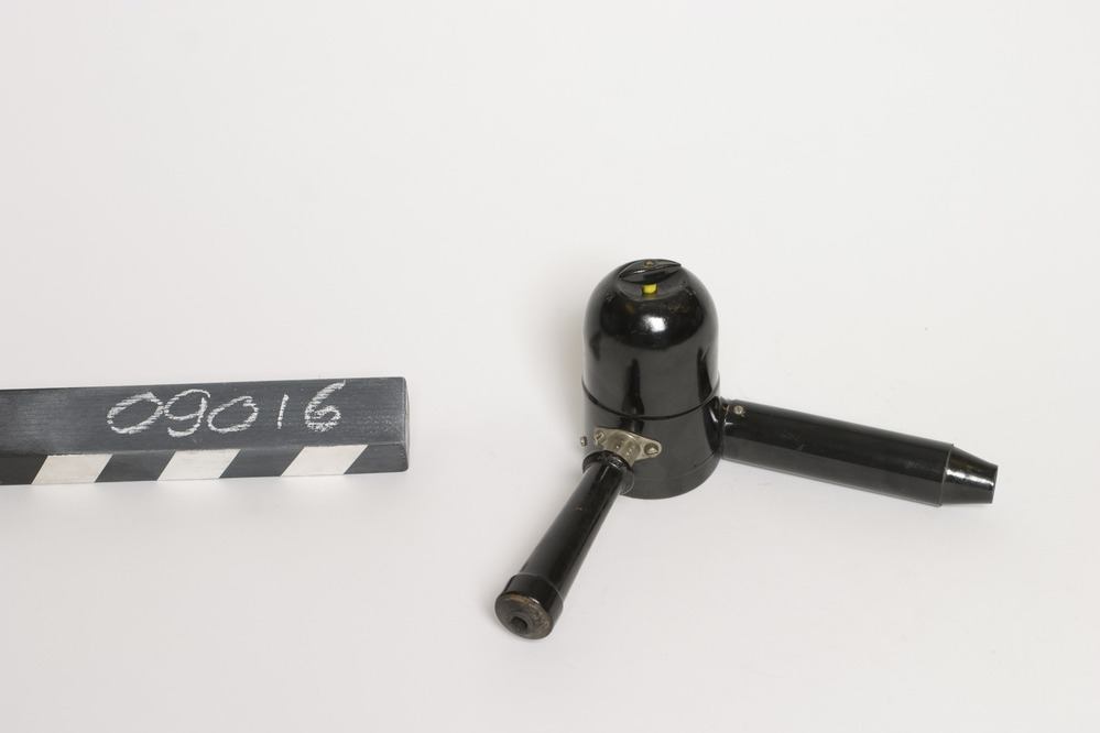 Onbekend fabricaat haardroger met radiaalventilator en elektrische verwarming, 110V 380W. In een ronde zwart gelakte behuizing.