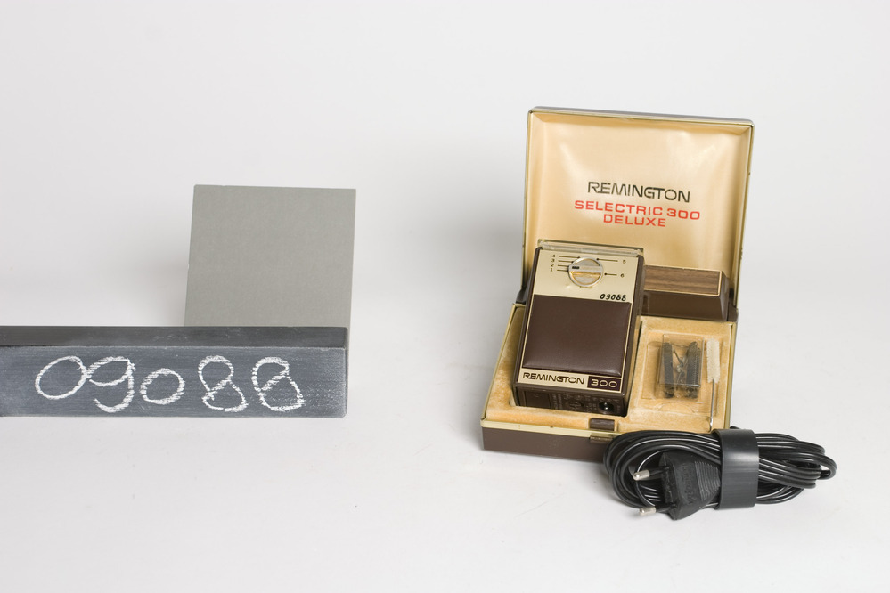 Remington elektrisch scheerapparaat, type Selektric 300 Deluxe, met drie vibrerende, in hoogte instelbare, dubbele scheerkoppen. Scheerkoppen in hoogste stand gezamenlijk uit te nemen. Aan-/uitschakelaar en netspanning-omschakelaar in apparaat. Scheerkoppen beschermd door hardplastic kapje. Borsteltje, 2 reservemesjes in verpakking. Los zwart tweeling-aansluitsnoer met eurocontactstop in zwarte zachtplastic binder. Bruine kunststof cassette, gelijmd. 110/220V - 50/60Hz.