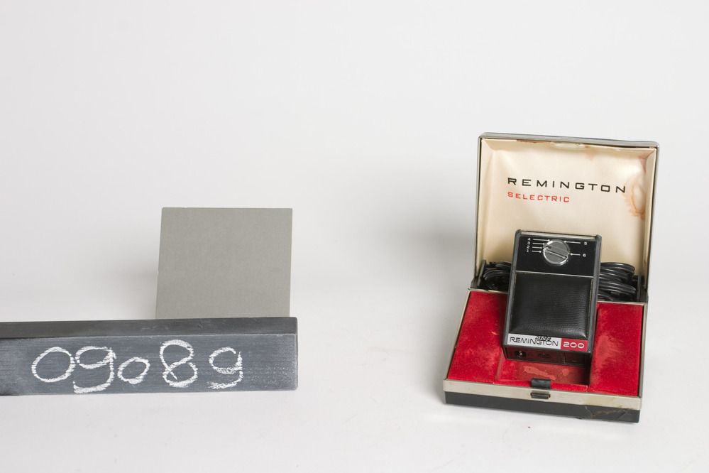 Remington 200 elektrisch scheerapparaat, 110/250V - 50/60Hz, met twee vibrerende, in hoogte instelbare, dubbele scheerkoppen. Het apparaat heeft een zwart kunststof huis, een aan-/uitschakelaar en netspanning-omschakelaar, en een los zwart tweeling-aansluitsnoer met euro-contactstop in zwarte zachtplastic binder. Inclusief zwarte assette met blankmetalen rand rond de opening en met rode voering. (binnendeksel van snoervak in cassette ...