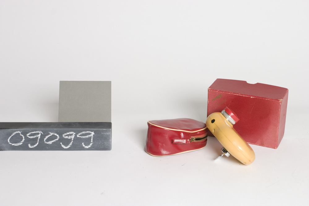 Thorens Riviera opwind veermotor scheerapparaat, met één vaste scheerkop en een geel kunststof huis met rode knop. Het apparaat is in-/uitschakelbaar door schuif, wordt aangedreven door een veermotor en heeft een rood plastic foudraal in kartonnen doos.