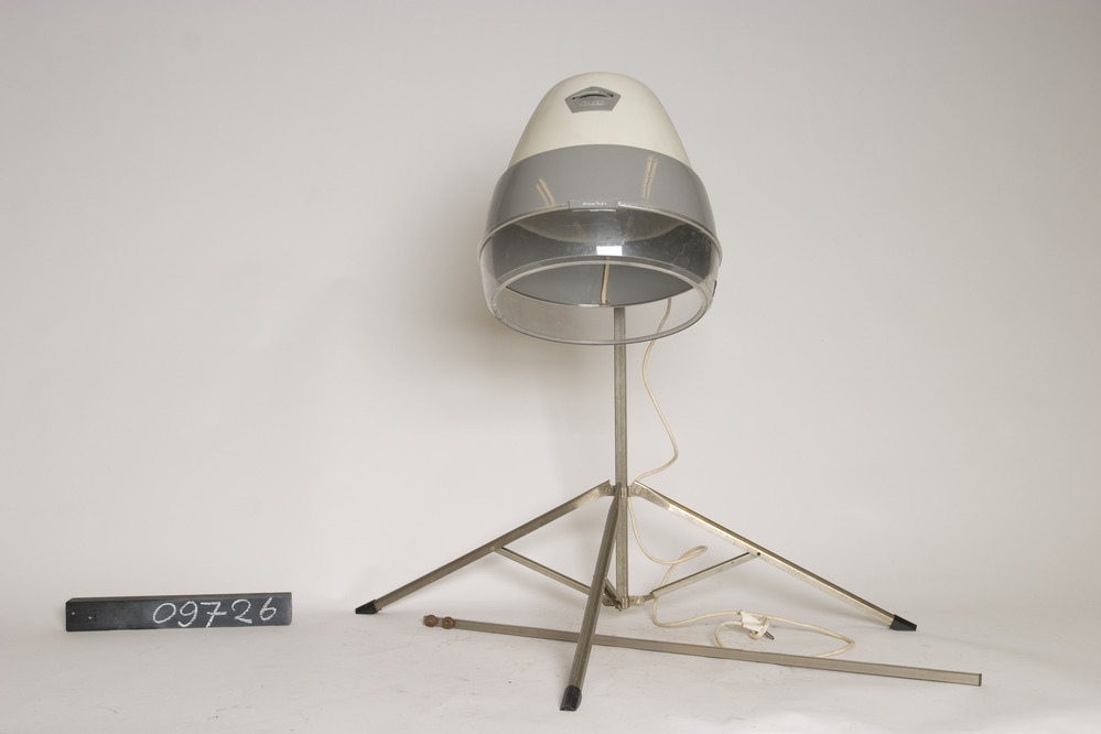 Kalorik Flamingo haardroogkap, met kunststof wit/grijze kap en transparante onderrand (met vijfhoekig logo van Kalorik op het witte deel). Op een driepotig statief met zwarte noppen.