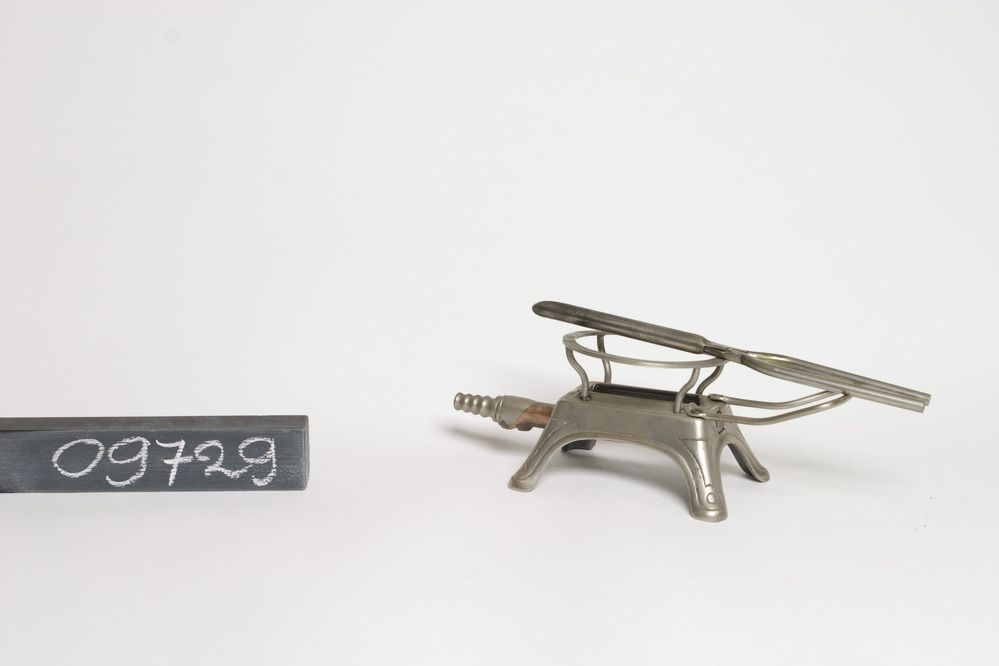 Onbekend fabricaat krultangverwarmer met gasverwarming in een rechthoekige bruine gietijzeren behuizing met vier pootjes en een gastule. Met bijbehorende vernikkeld metalen krultang.