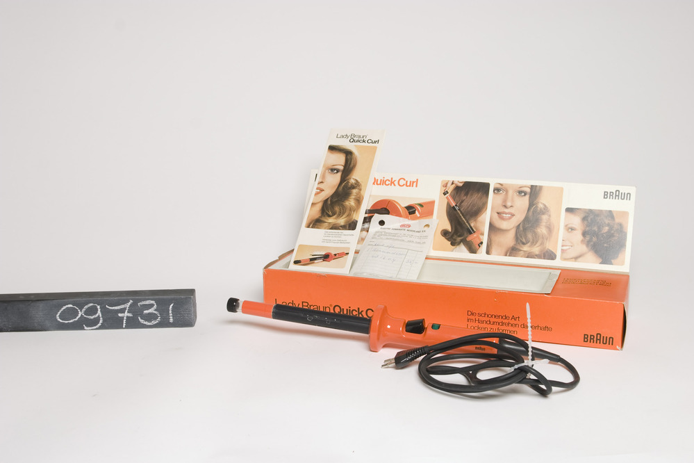 Lady Braun Quick Curl krultang met elektrische verwarming, 48W. In een langwerpige oranje/zwart buisvormige metalen behuizing met een oranje kunststof handvat, groene verlichting en een zwart kunststof aparaatsnoer met aangegoten contactstop. In de originele verpakking.