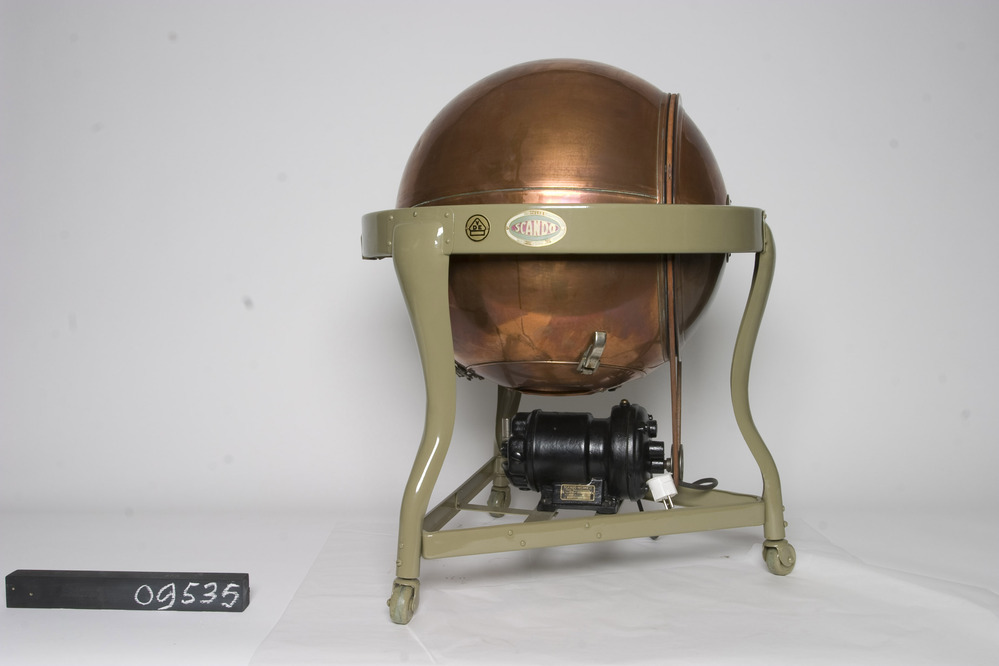 Het Berlijnse bedrijf SCANDO bracht in 1913 een wasmachine op de markt met een koperen bolvormige trommel. Op de zijwand zijn aan de binnenkant daarvan vaste schoepen bevestigd. Deze kantelen het wasgoed door het sop als de bol wordt rondgedraaid. Een elektromotor (165W) drijft via een tandwielvertraging en lederen v snaar de wasbol aan.