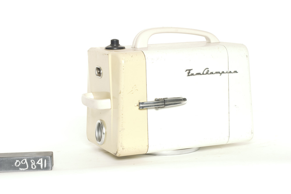 F.A.M. elektrische sledestofzuiger of ketelstofzuiger, 220V - 450W, met een wit/geel gelakte behuizing, zwarte knop aan de bovenzijde, glijring aan de onderzijde en afgeschermde toestelcontactstop. Fabr.serienr: 52859. Merktekens: goedgekeurd door KEMA.