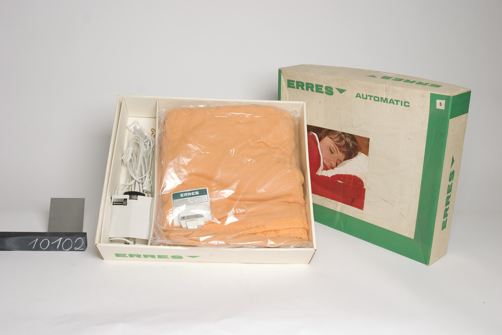 Erres warmtedeken met elektrische verwarming, een wit tweelingsnoer en rechthoekige witte trafokast met aan /uit knop en een draaiknop voor warmteregeling 10 standen. In een oranje wollen uitvoering. Originele groen/witte doos met de foto van het hoofd van een slapende vrouw.