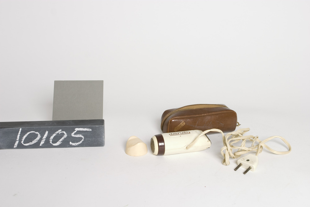 Riam Dandy elektrisch scheerapparaat, 125/220V - 11W, in bruine leren foudraal, met vaste scheerkop in afschroefbare scheerkophouder. Het apparaat wordt aangedreven door een motor op netspanning, bestaat uit een bruine en crèmekleurige kunststof behuizing, heeft verder ook tondeuse met dubbele kop, en een vast geel aansluitsnoer. Aandrijving tondeuse door excentrische askop. Netspanningomschakelaar in apparaat.