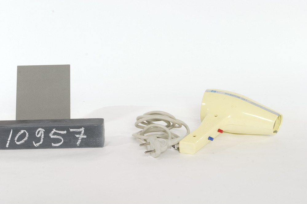 Inventum GF1 haardroger met axiaalventilator en elektrische verwarming. In een pistoolvormige gele kunststof behuizing met een rode en blauwe knop (heeft een grijs plat kunststof snoer en aangegoten contactstop).