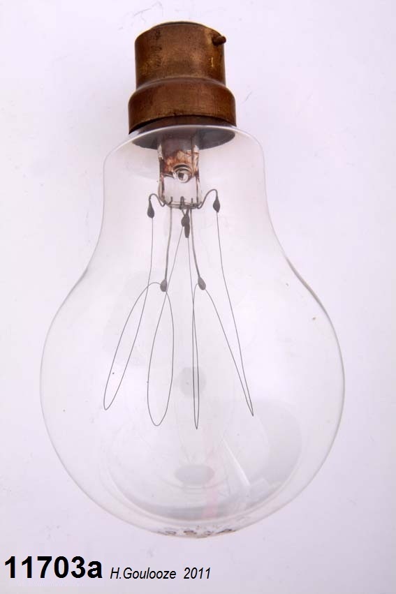 Philips kooldraadlamp, 220-230V-80W-22K, met een blank glazen ballon (met enige zwarte aanslag), een messing B22 huls, een viermaal geluste kooldraad met vier steundraden en twee stroomgeleiders, en een inwendige pompstengel.