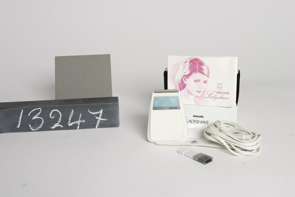 Philips wit kunststof Ladyshave scheerapparaat, 110/220V, met een blauw gestipt kader onder het mesje. Het apparaat is inclusief etui, snoer, kwastje en een boekje waarop het roze gezicht van een vrouw is afgebeeld.