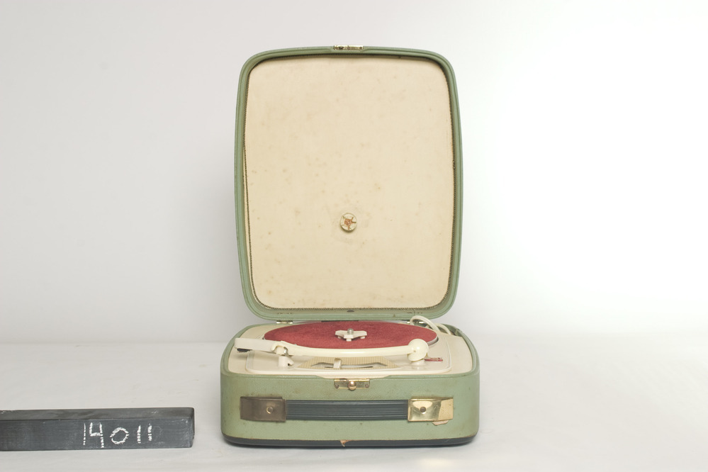 Philips AG2145 mono platenspeler, in groene koffer met afgeronde hoeken, met rood beklede draaitafel en crème kleurige pick up arm. De grammofoon kan alleen de trillingen uit de groef van de ronddraaiende grammofoonplaat opnemen en moet op een versterker/radio aangesloten worden om het geluid weer te kunnen geven. De pick up arm is van kunststof ...