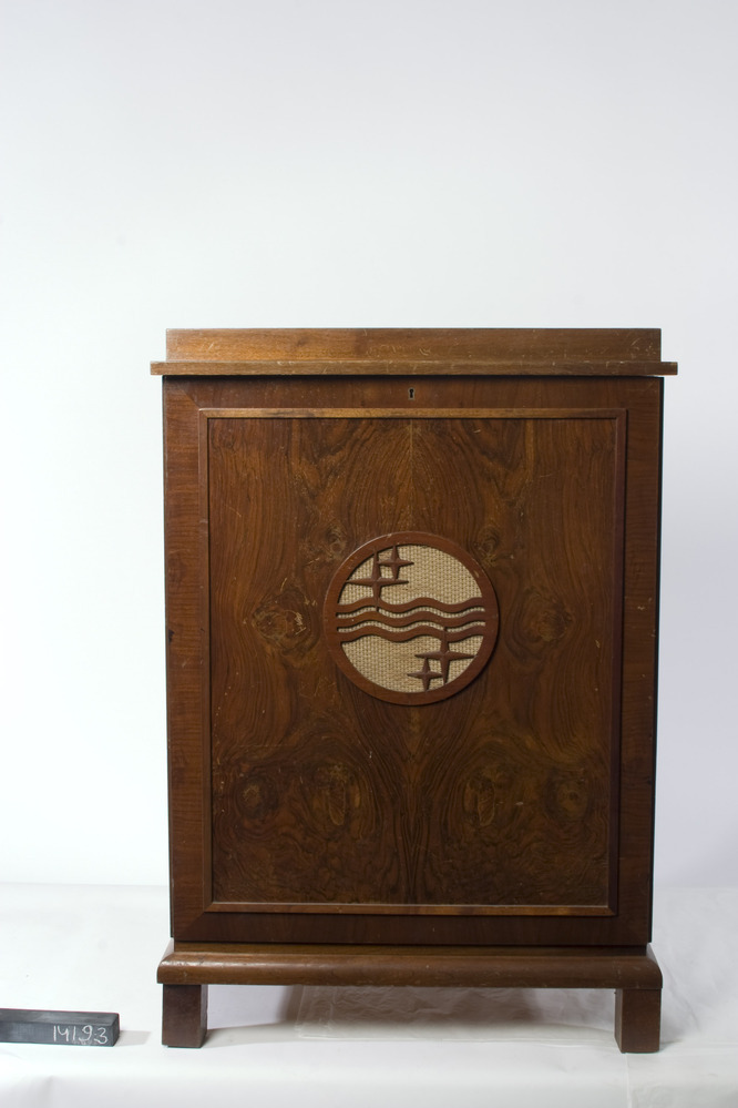 Philips 770A omroepontvanger met platenspeler, 110/240V - 100W, in houten salonmeubel op vier hoekige poten, met boven aan de voorzijde een klein sleutelgat. De luidspreker zit achter een houten front met de sterren en golven van het Philips-logo. Fabr.serienr: 2497. (alle buizen ontbreken; pick-uparm ontbreekt; bedrading in slechte staat).