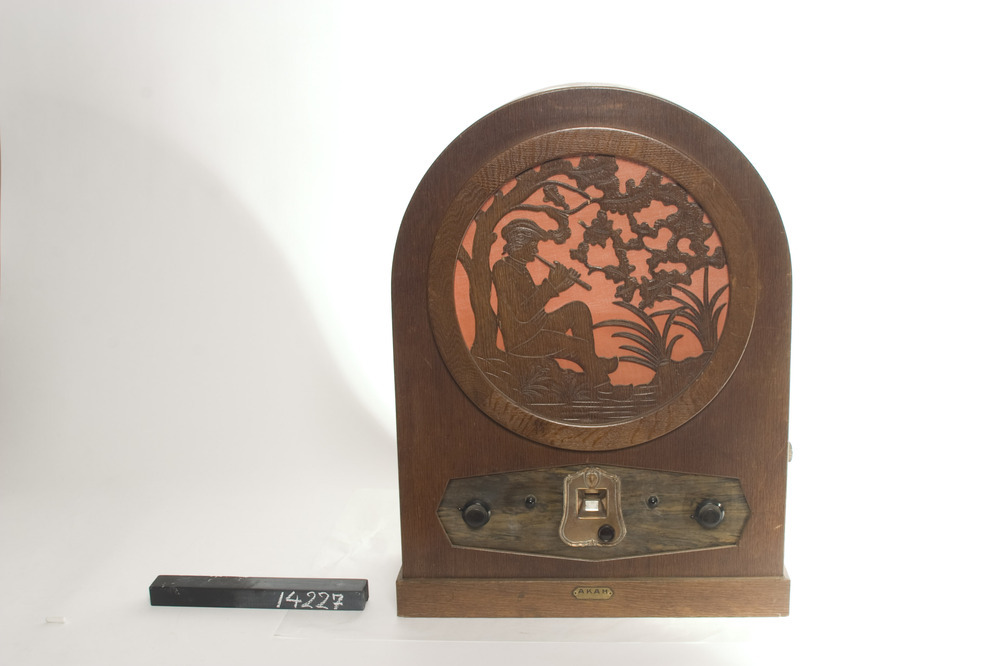 AKAH omroepontvanger, in een houten kast met boogvorm, zonder achterwand. Het apparaat heeft achthoekig horizontaal paneel met twee zwarte draaiknoppen, twee kleine zwarte draaiknoppen, en in het midden een metalen plaatje voor zenderkeuze met een kleine zwarte draaiknop. Voedingsspanning: separate voeding. (voeding en luidspreker ontbreken). De kunstenaar Ter Reegen ontwierp het ronde voorfront van houtsnijwerk ...