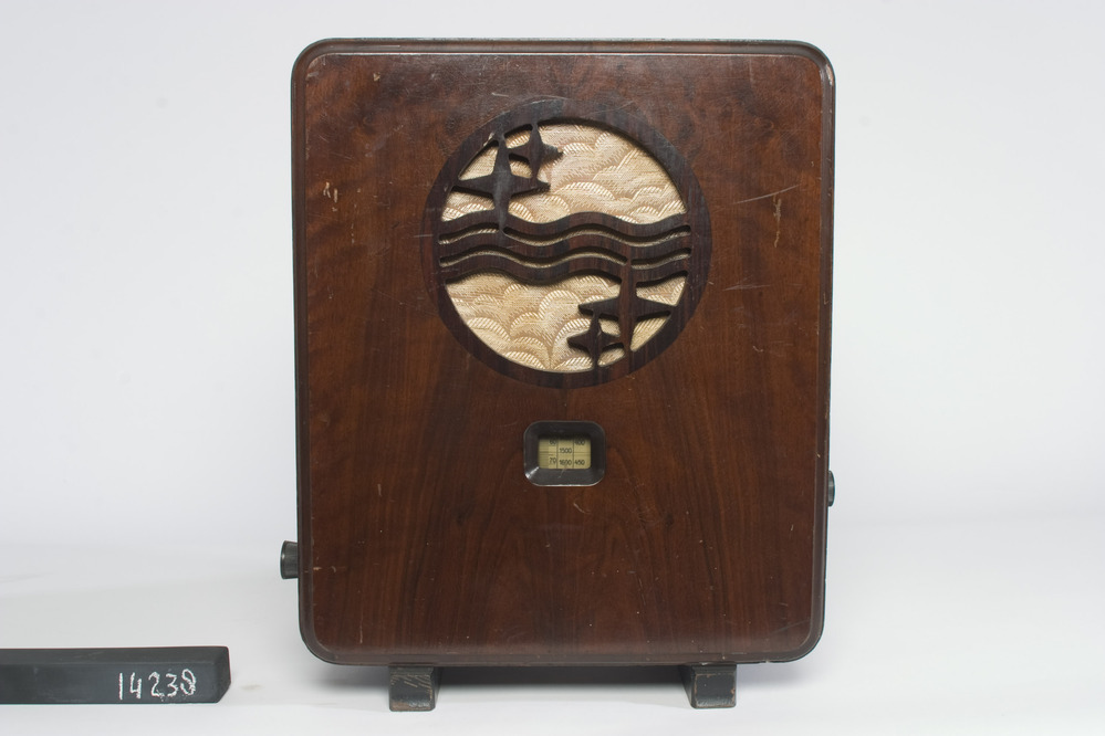 Philips 730A omroepontvanger, 120/240V - 44W - 50Hz, in een houten kast zonder achterwand, met een klein venstertje voor zenderkeuze. De ingebouwde luidspreker zit achter een houten front met de sterren en golven van het Philips-logo, en aan de zijkanten zitten de kunststof draaiknoppen voor volume en zenderkeuze. Fabr.serienr: R 12075.