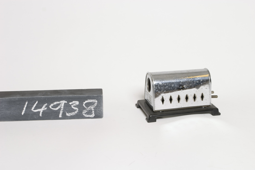 Paris krultangverwarmer met elektrische verwarming. In een langwerpige half ronde vernikkeld metalen behuizing, met twee stekkerpennen en op een zwart metalen voetplaat met vier pootjes.