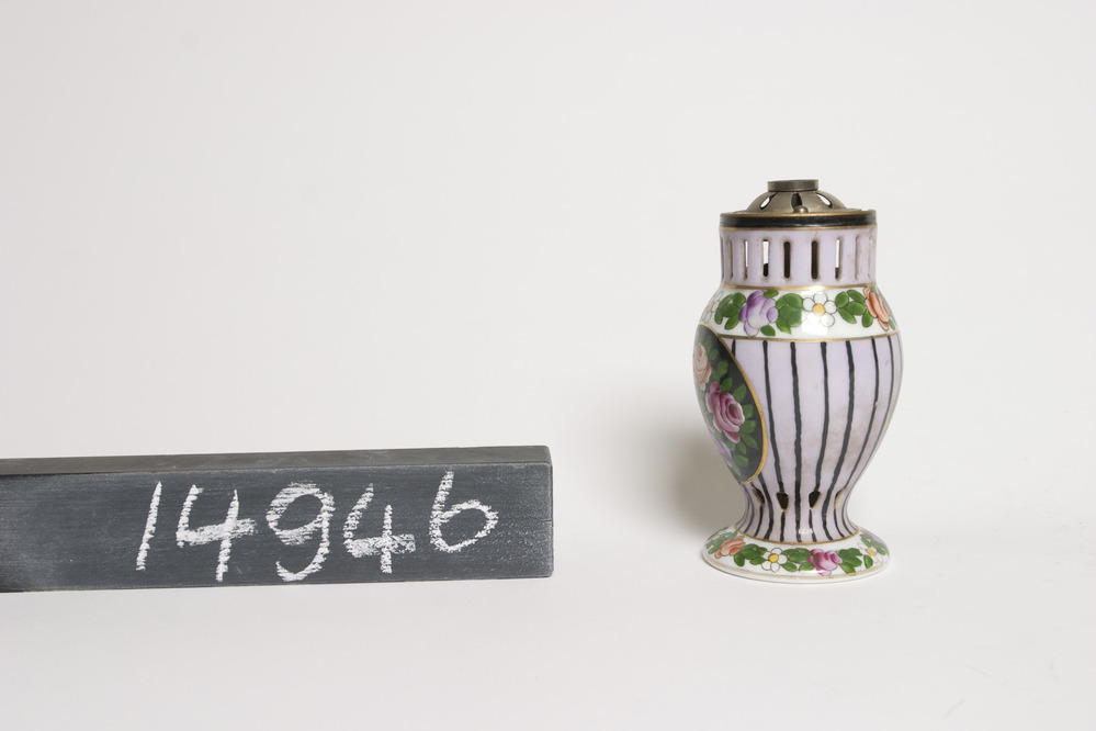 Onbekend fabricaat krultangverwarmer met elektrische verwarming in een paars gedecoreerde porseleinen vaas. Op de vaas zijn rozen en madeliefjes geschilderd, lopen er zwarte verticale lijnen over de rondingen van het aardewerk en zijn er openingen aan de boven en onderkant gemaakt om de warmte af te voeren.
