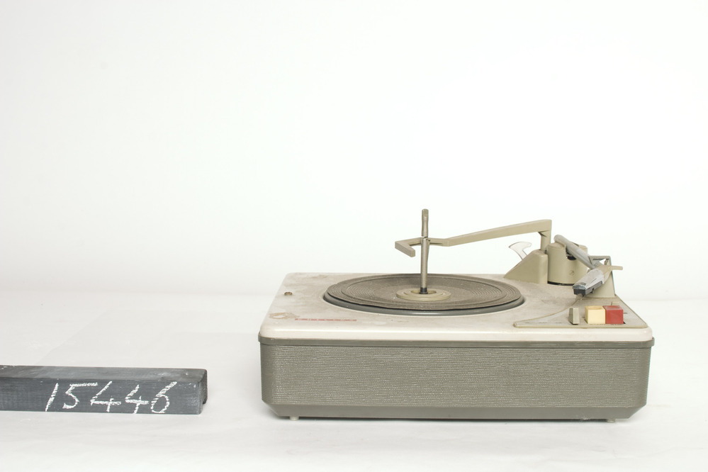 Philips AG1125 platenwisselaar in een kunststof kast, 110/240V, met rechts een witte en rode knop om te starten en te stoppen. Het apparaat heeft aan de zijkanten een donkergrijze groffe oppervlakte, terwijl de bovenkant lichtgrijs en egaal is (met aan de linkerkant in het rood de naam 'Philips'). Opgenomen vermogen: 6W. Fabr.serienr: 123247. Toerental: 16, ...