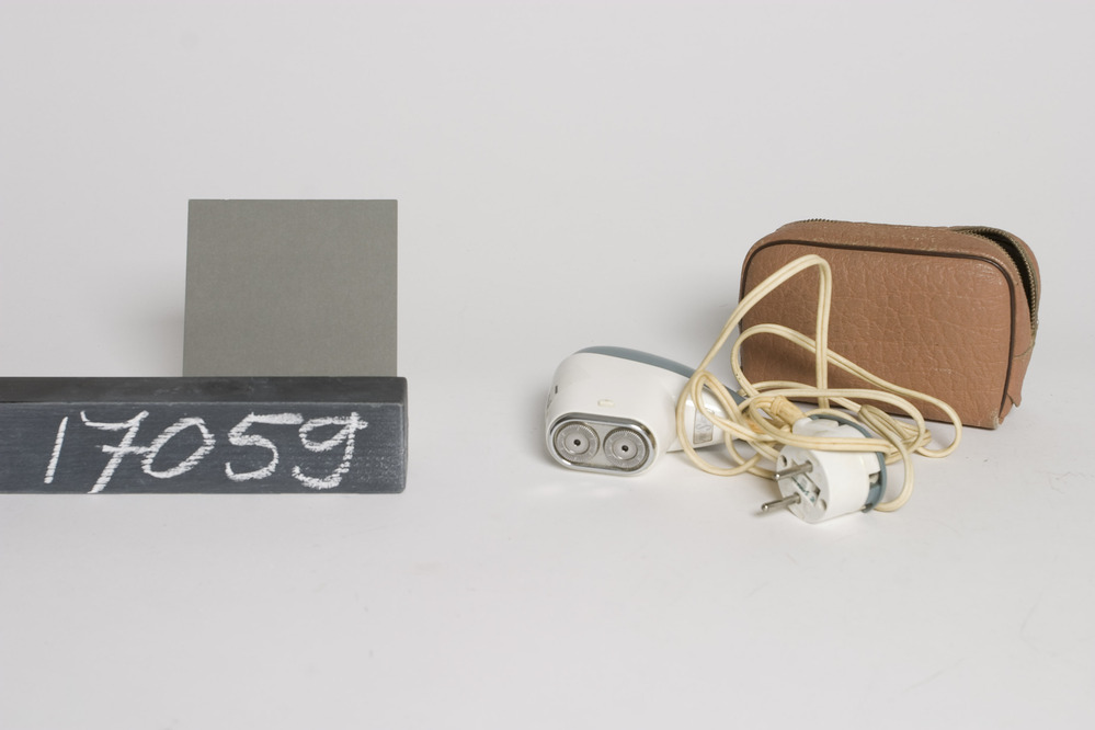 Philips elektrisch scheerapparaat met twee scheerkoppen. Het apparaat heeft een witte en grijsblauwe behuizing en een geel snoer. Fabr.serienr: 3082 6396. Merktekens: in bruin leren etui.