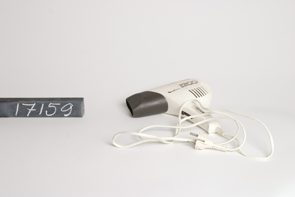 Moulinex haardroger type 1200 met axiaalventilator en elektrische verwarming, 220V 1200W. In een pistoolvormige zwart/witte kunststof behuizing waaraan een plat twee aderig wit kunststof snoer met een aangegoten universele contactstop is bevestigd. Fabr.serienr: code 210