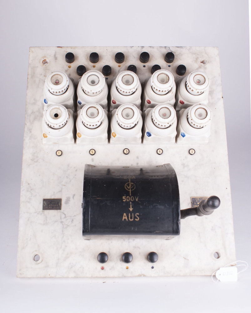 Keern marmeren groepenpaneel, 500 V, met hoofdschakelaar en tien witte stoppen (gemarkeerd met blauwe, rode en gele stippen). De zwarte schakelaar heeft een gouden opdruk met '500V AUS' en wordt geflankeerd door twee metalen plaatjes met 'elekTRO-TECHNISCH INST. BUREAU D. KEERN DELFT'. Onder aan de voorzijde van het bord zitten nog drie zwarte knoppen met ...