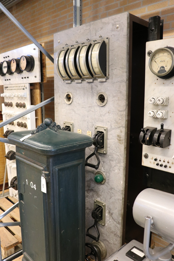 Onbekend fabricaat marmeren bedieningspaneel, met vier verticale boogvormige meters, groene lampen, vier grote zwarte schakelaars en twee draaiwielen. Het hier getoonde paneel maakte deel uit van de technische ruimte en fungeerde als schakeleenheid voor het bedienen van de ventilatoren van de toiletgroep.