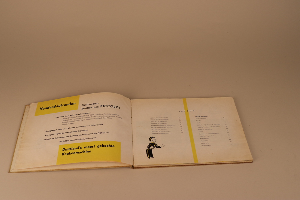 Piccolo huishoudmotor (deel A) met verfspuit (deel B), komborstel (deel C), vloerwrijver (deel D), shamponeeraanzetstuk (deel E), messenkruis (deel F), deksel (deel G), opzetstuk met diverse rasp-schijven (deel H), onbekend opzetstuk (deel i), boekje "Piccolo helpt de huisvrouw" (deel-J).