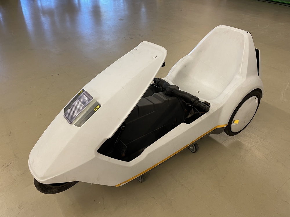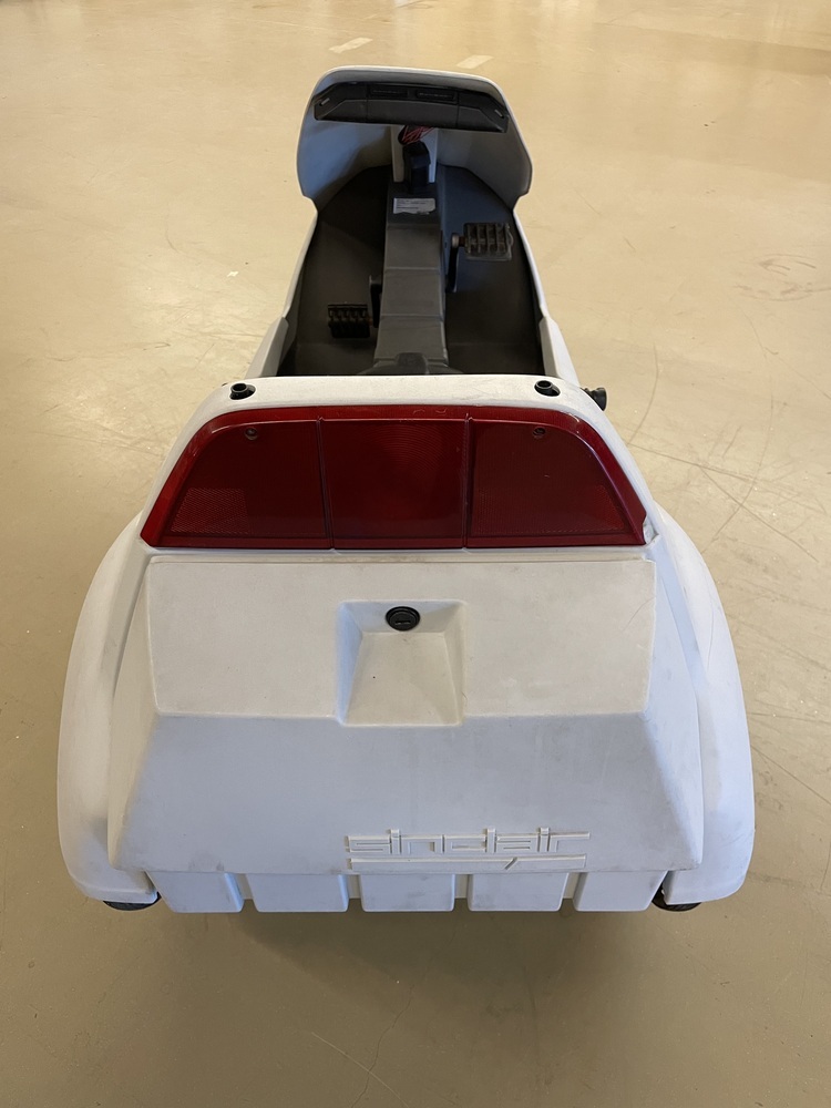 Sinclair C5 elektrocar, driewielige ligfiets met trappers in lichtgrijze kunststof behuizing. Het voertuig heeft in de be- huizing een kuipvormig zitvlak met vlak daarvoor een donkergrijs stuur met handvatten en handremmen (het stuur wordt bediend met de benen van de bestuurder over het stuur). Voor op de elektrocar zit een verticale koplamp met daarop 'MAGNALITE ...