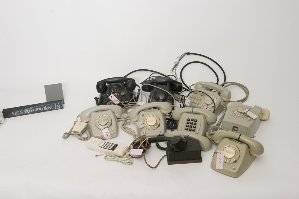 Verschillende telefoons b: Kunststof telefoon met draaischijf d: Kunststof telefoon met toetsen e: Kunststof telefoon uit één stuk