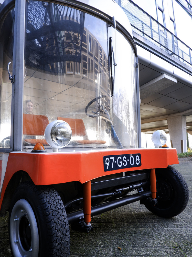 Witkar, met rood front, wit dak, brede lange ramen en ronde koplampen. De witte stoelen zijn bekleed met oranje stof.