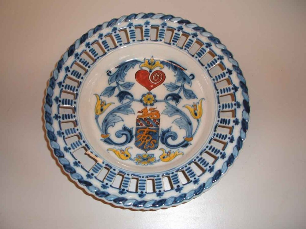 Bordje ajour, veelkleurig embleem FRS en embleem Frisiana, blauwe rand.
