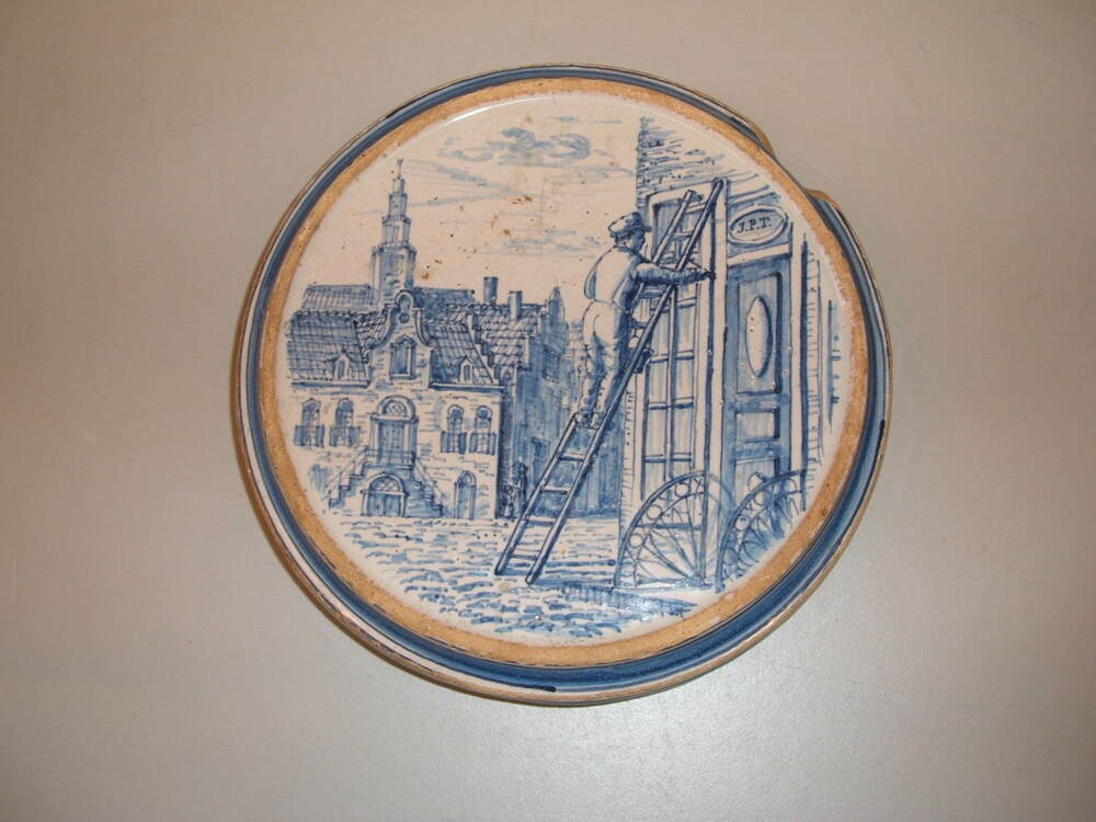 onderzetter, dorpsgezicht in blauw met huisschilder met ladder voor de deur van J.P.T.(ichelaar). Afkomstig uit de familie,voorstelling vermoedelijk fantasie.