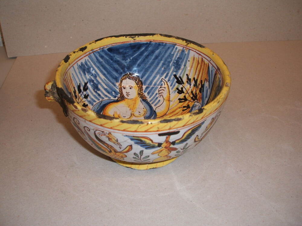 Klontjes pot, met veelkleurig decor. Binnen in het onderste deel van de doos een afbeelding van een naakt vrouw/zeefiguur, aan de buitenzijde rondom decoratie van grotesken. Deksel ontbreekt